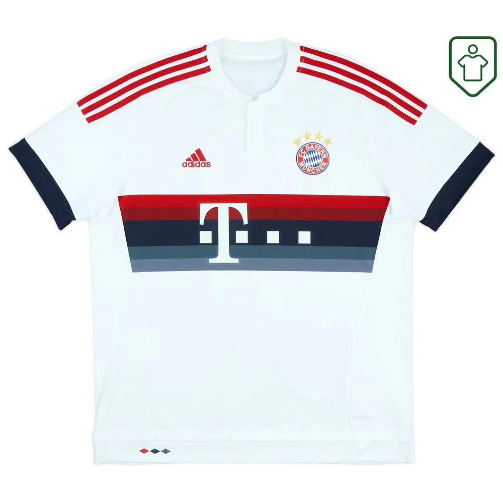 Maillot extérieur porté lors de la dernière saison de Pep Guardiola, où l’équipe a remporté un autre titre de Bundesliga et la DFB Pokal après une victoire aux tirs au but face à son rival Borussia Dortmund, mais a manqué la finale de la Ligue des champions à cause de la règle des buts à l’extérieur face à l’Atlético Madrid en demi-finales. Robert Lewandowski a continué son incroyable forme avec 42 buts en toutes compétitions. C’était la première saison de Vidal à l’Allianz Arena après son transfert à 37 millions d’euros en provenance de la Juventus. Le Chilien a joué 48 matchs et marqué 7 buts.