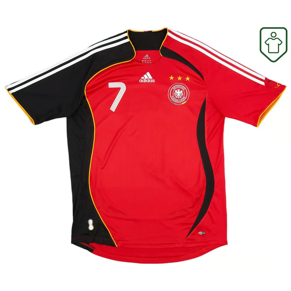Maillot extérieur porté par l’équipe de Jürgen Klinsmann lors de leur tournoi à domicile en 2006. Les buts de Miroslav Klose et Lukas Podolski ont fait la différence pour Die Mannschaft durant la phase de groupes, qui ont ensuite facilement éliminé une équipe suédoise comprenant Henrik Larsson et Zlatan Ibrahimović en huitièmes de finale. Les penalties ont de nouveau souri aux Allemands, qui ont battu l’Argentine 4-2 aux tirs au but en quarts de finale. La demi-finale les a opposés à l’Italie au Signal Iduna Park, un match serré finalement décidé par deux buts tardifs en prolongation, signés Fabio Grosso et la légende de la Juve Alessandro Del Piero. Les Allemands ont trouvé une consolation en battant le Portugal 3-1 lors du match pour la troisième place grâce à deux buts de Bastian Schweinsteiger, assurant la médaille de bronze.